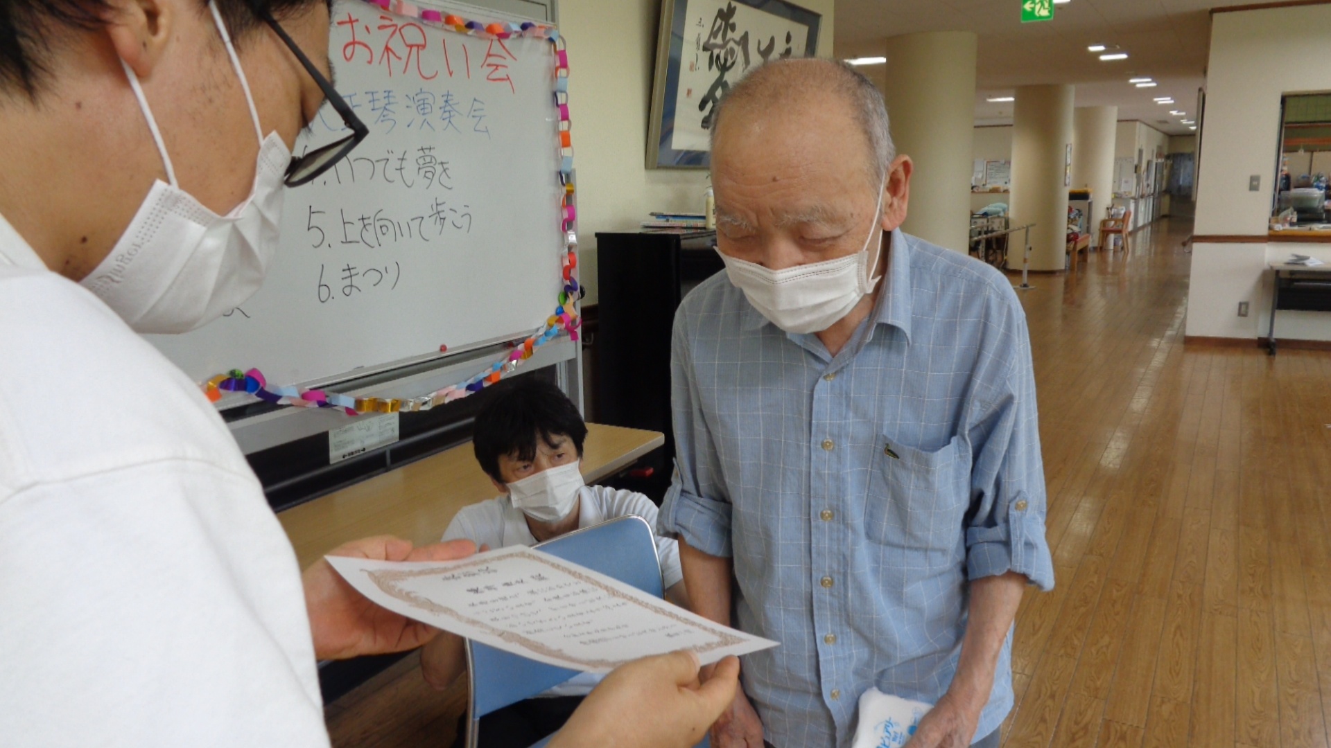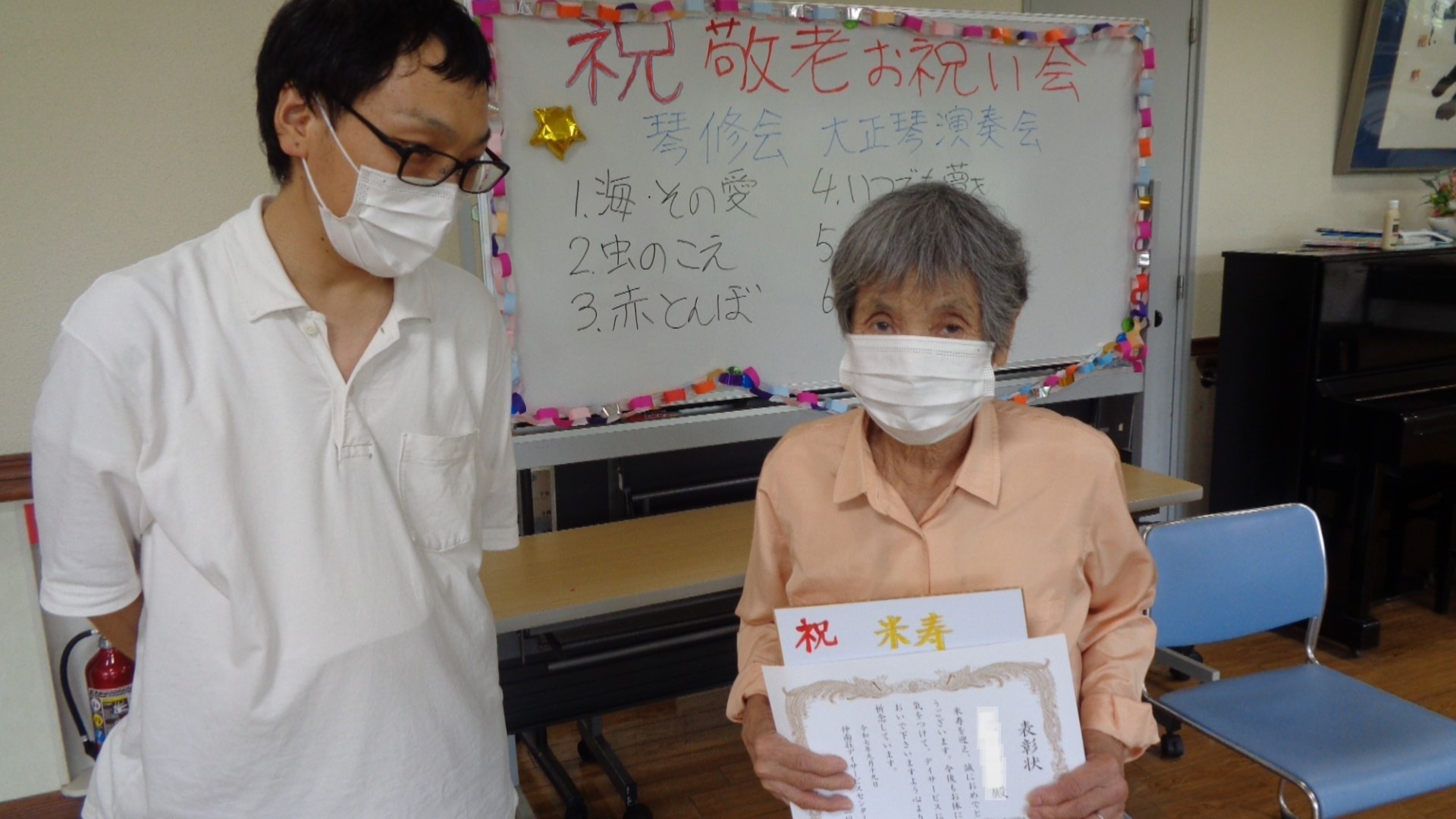 そして最後には今年88歳の「米寿」を迎えるご利用者に、表彰状と色紙をお渡ししてお祝いをさせていただきました。