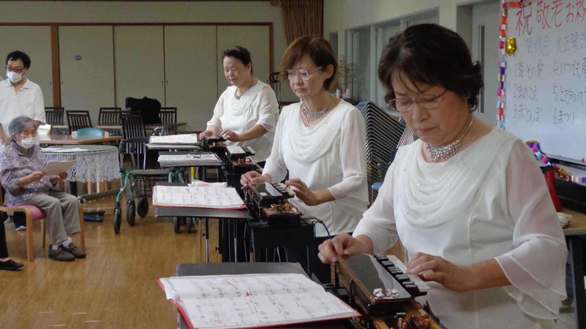 石川さゆりさんの『天城越え』や北島三郎さんの『まつり』などの名曲に皆さまじっくりと耳を傾けておられました。また『上を向いて歩こう』『赤とんぼ』などの曲では、ご利用者も一緒に歌いました。大正琴の美しい音色に、ご利用者のみなさんも熱心に聴き入っておられ、心温まるひと時となりました。