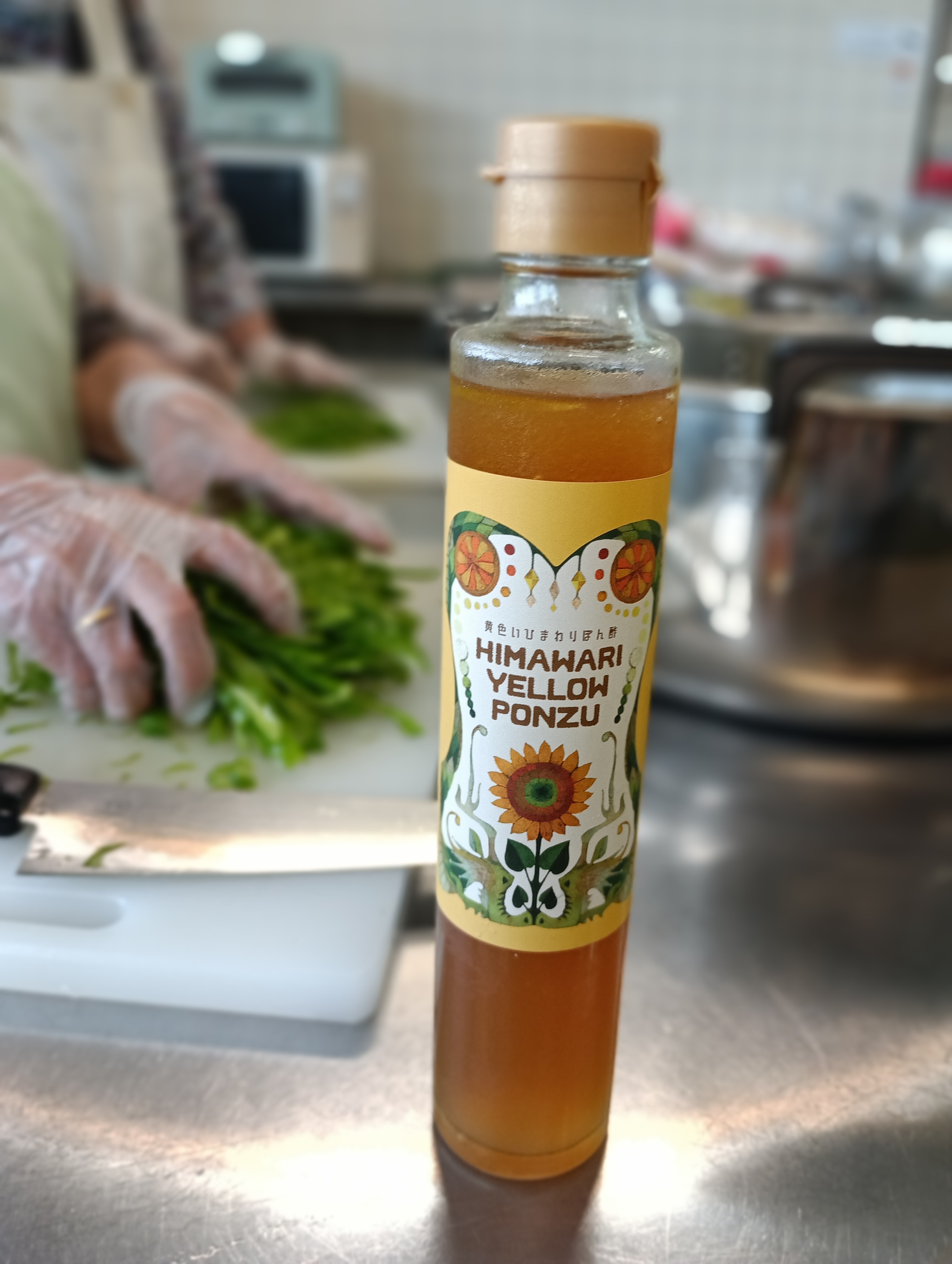 ひまわりオイルの入った「黄色いひまわりぽん酢 HIMAWARI YELLOW PONZU」は一般社団法人サンフラワーまんのう様が香川大学農学部と共同開発されたものです。オレイン酸とビタミンEたっぷりのひまわりオイルに、瀬戸内の柑橘が入った爽やかでまろやかな味わいのぽん酢です。
