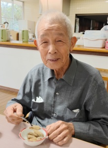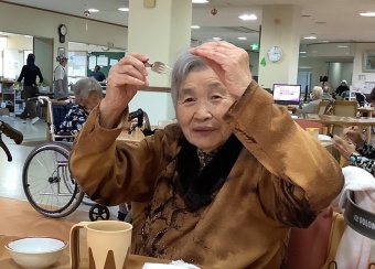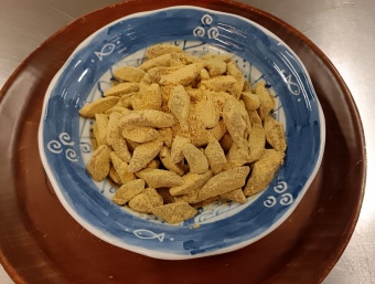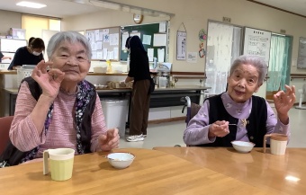 「なつかしい!紙芝居を観にいったら売っとったんよ」「昔は砂糖が貴重やきんごちそうやったなぁ」「おいしい!あんた、お菓子屋が開けるわ」などお話を聞かせていただきました。そんなに固くなく、粘りも少ない仕上がりにしたつもりでしたが、入れ歯が動いてしまった方もチラホラ・・・そこは反省点です(。-人-。)