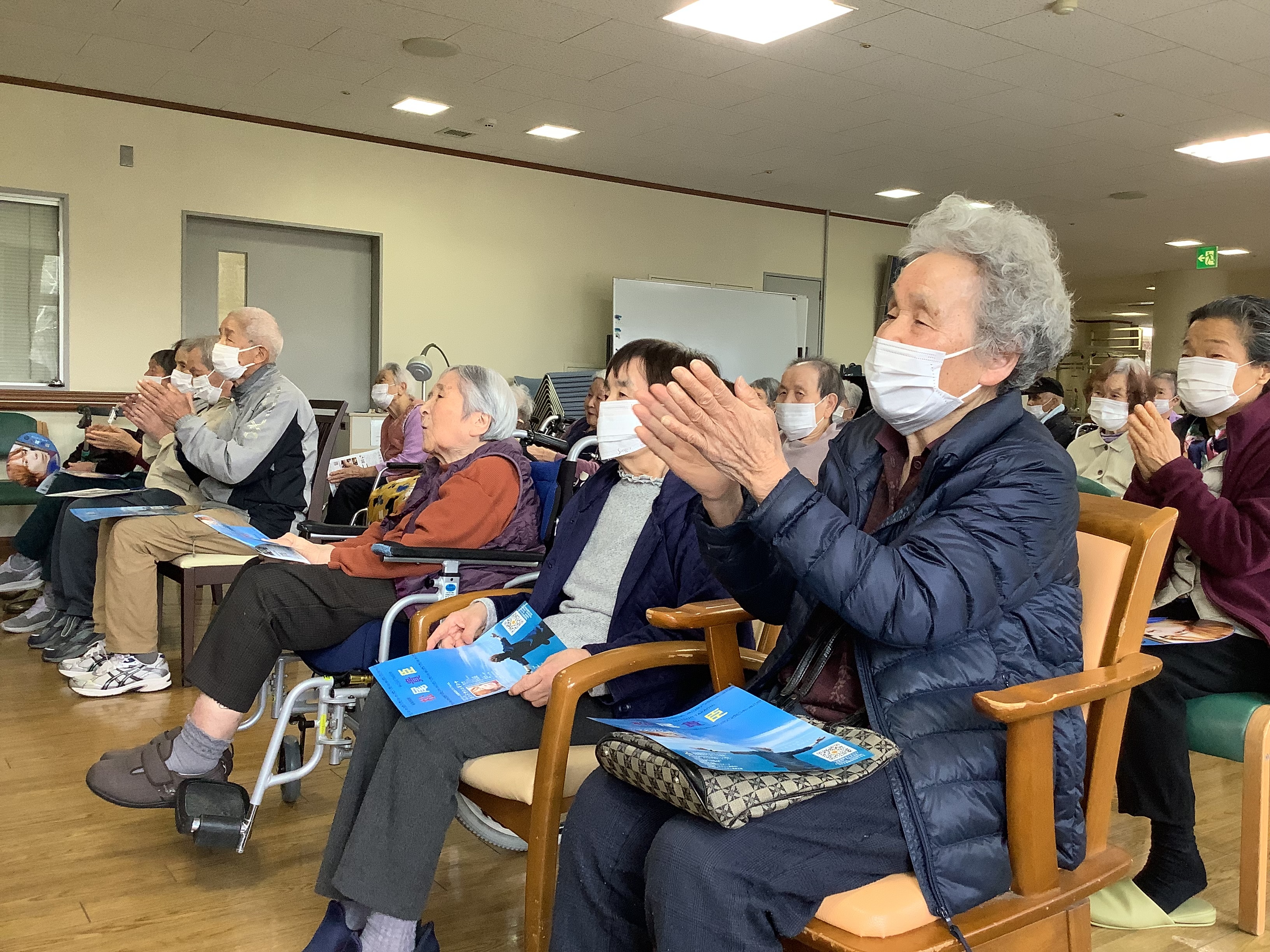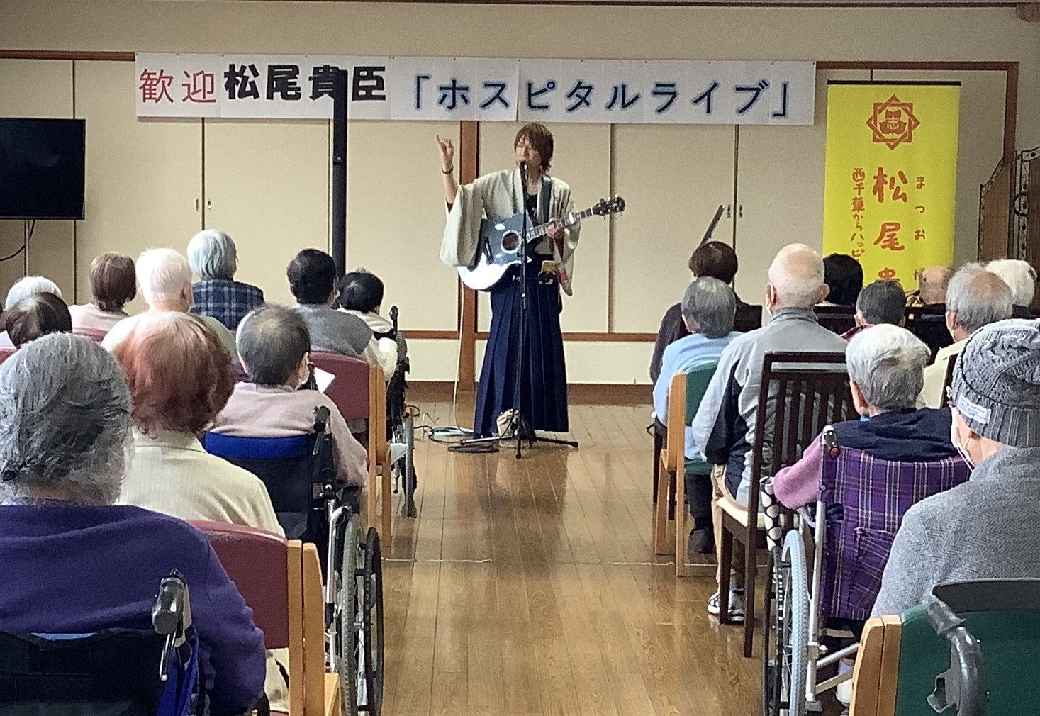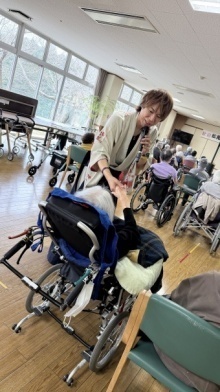 久しぶりの再会にもかかわらず、その歌声は当時のまま力強く、会場からは「迫力があるなぁ」「優しい歌声やなぁ」といった声が自然とこぼれました。オリジナル曲に加え、高齢のご利用者の皆さんにも馴染みのある曲も披露してくださり、会場はあたたかい空気に包まれました。