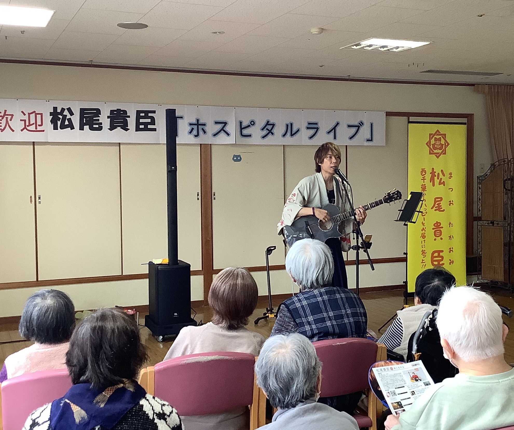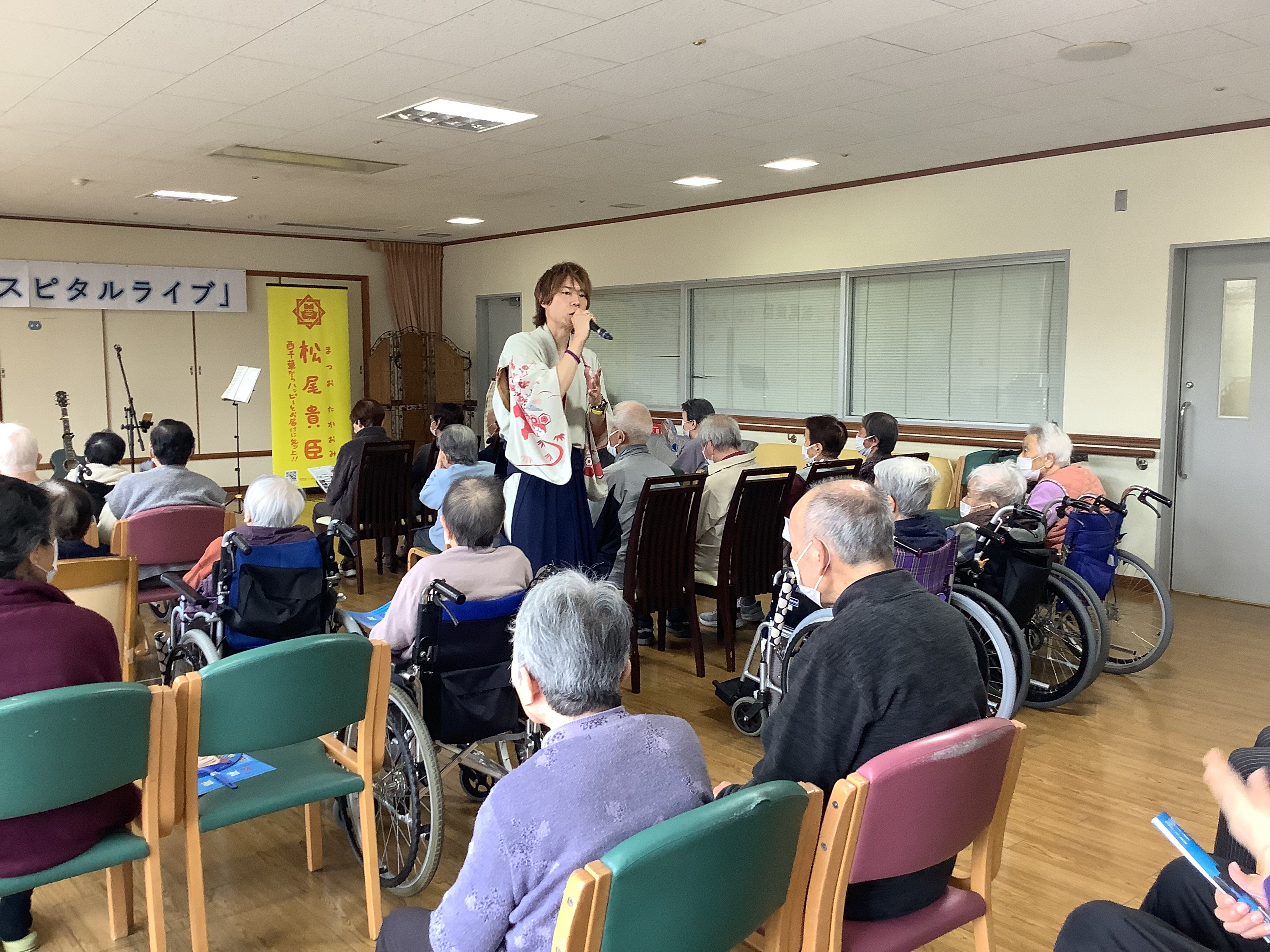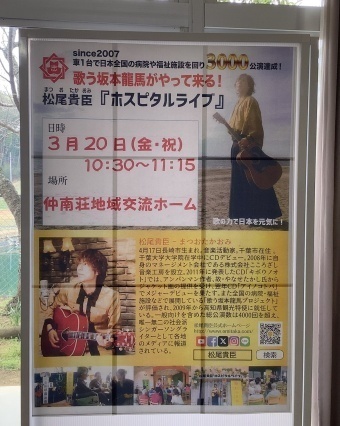 3月20日(祝)、仲南荘では長崎市出身のシンガーソングライター・松尾貴臣さんをお迎えし、7年ぶりとなるライブを開催しました。松尾さんは2005年にCDデビューし、音楽ホールやライブハウスでの活動に加えて、全国の病院や福祉施設での訪問ライブを3,000ヶ所以上で行っている方です。