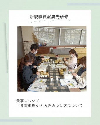 食事の研修では、介助の基本姿勢として”優しく、思いやりをもって”寄り添うことの大切さを共有しました。とろみの付け方も体験し「濃度で飲み込みやすさがこんなに変わるとは思わなかった」「一口の量に気をつけたい」といった気づきの声が上がりました。