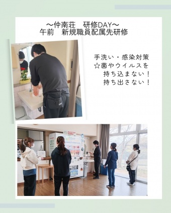 午前中は新しく仲間に加わった職員を対象にオリエンテーション・手洗い・感染症対策・食事形態についての研修を実施しました。手洗い・感染症対策の研修では「病原菌を持ち込まない」ための基本を改めて確認し、正しい手洗い手順を実際に体験してもらいました。