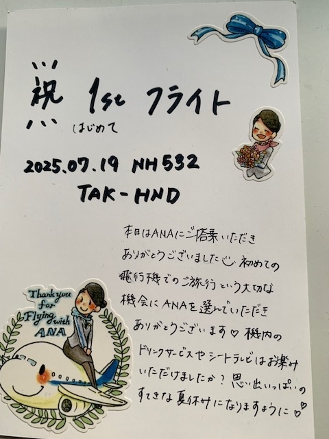 初めてのフライトということで客室乗務員さんからメッセージをいただきました。
