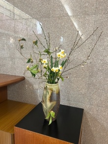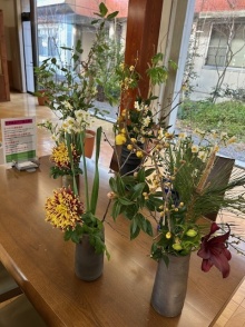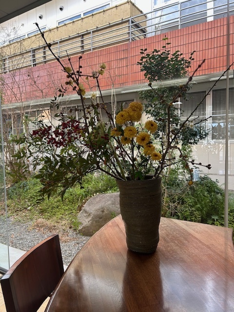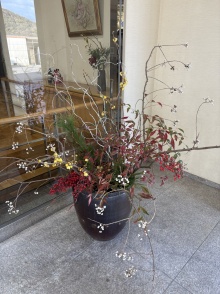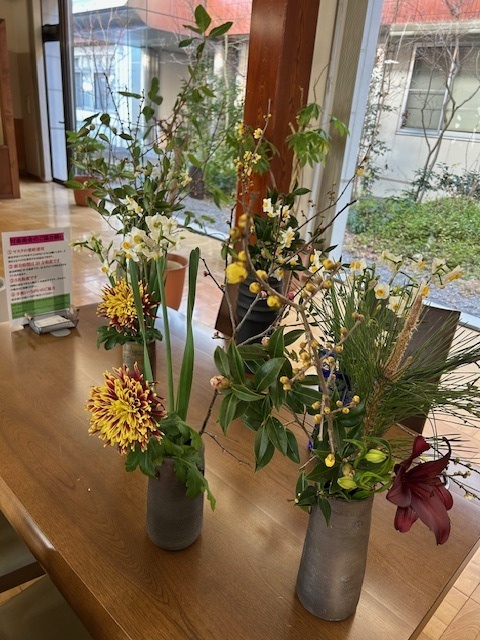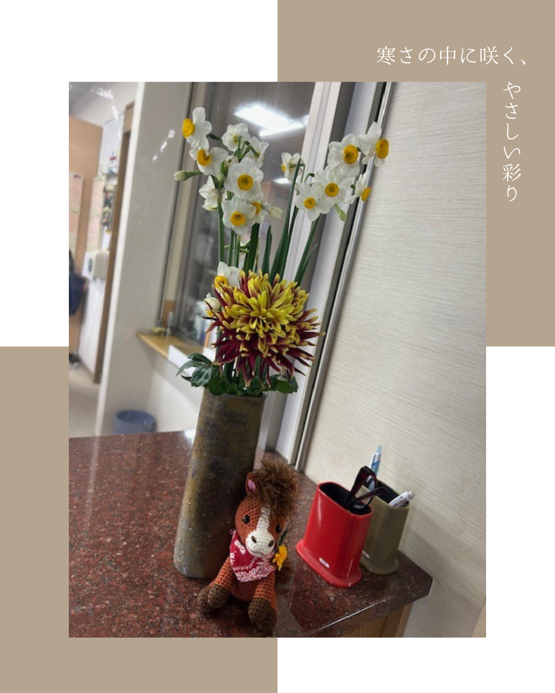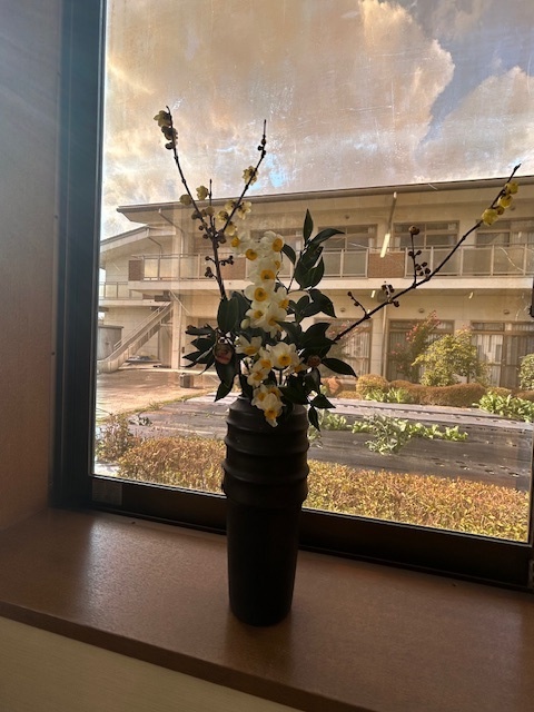 2026.02.03 寒さの中に咲く、やさしい彩り 寒さの中にも、少しずつ春の気配が感じられる頃。 いただいた寒椿やロウバイ、水仙、梅の枝を、正月花と合わせて活けました。 思いのほか花瓶がたくさんになり、 事務所や玄関、洗面台など、あちこちがほんのり華やかに。 廊下を通るスタッフが、ふと香りに気づいてくれたら嬉しいものです。 季節の小さな変化を、みんなでそっと分かち合えますように。