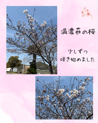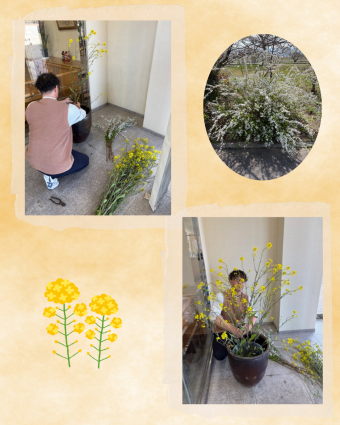 満濃荘の玄関に、菜の花とゆきやなぎが春を運んでくれました。