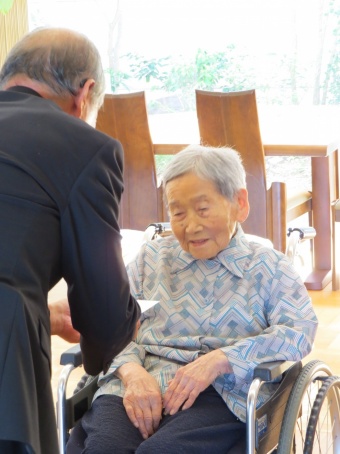 2024.09.25 まんのう町高齢者訪問 9月19日に100歳以上の方にまんのう町長が訪問に来られました。 当日は一人ひとりにお祝いを渡していただき、受け取られたご利用者も大変喜ばれていました。 涙を流される方もおられ、とても良い時間となりました。