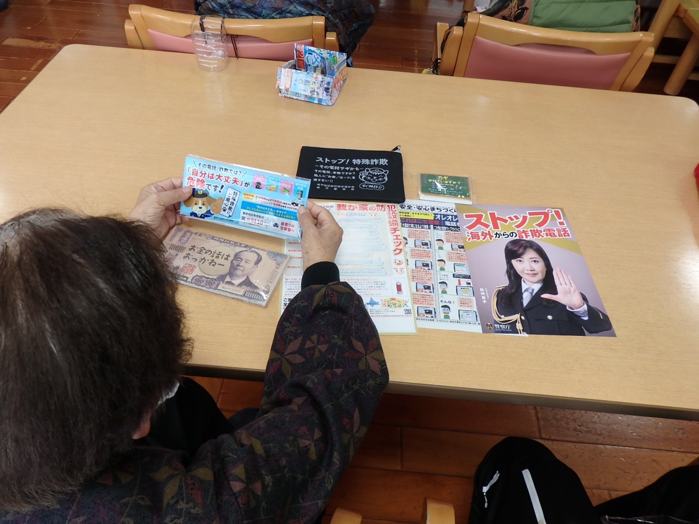 今、急増している「特殊詐欺」や防犯についてのお話をしていただきました。ご利用者は資料を見ながら熱心に聞いていました。